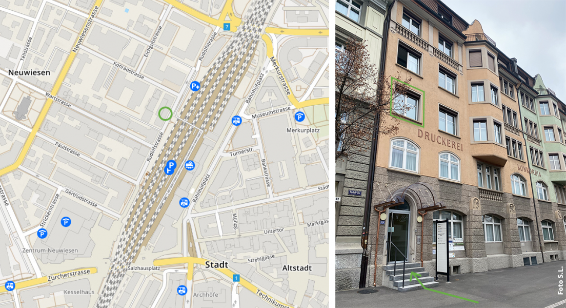 Die Praxis befindet sich unmittelbar auf der Rückseite vom Hauptbahnhof Winterthur im alten Druckerei-Gebäude im 2. Stock in der Praxisgemeinschaft Ru19.